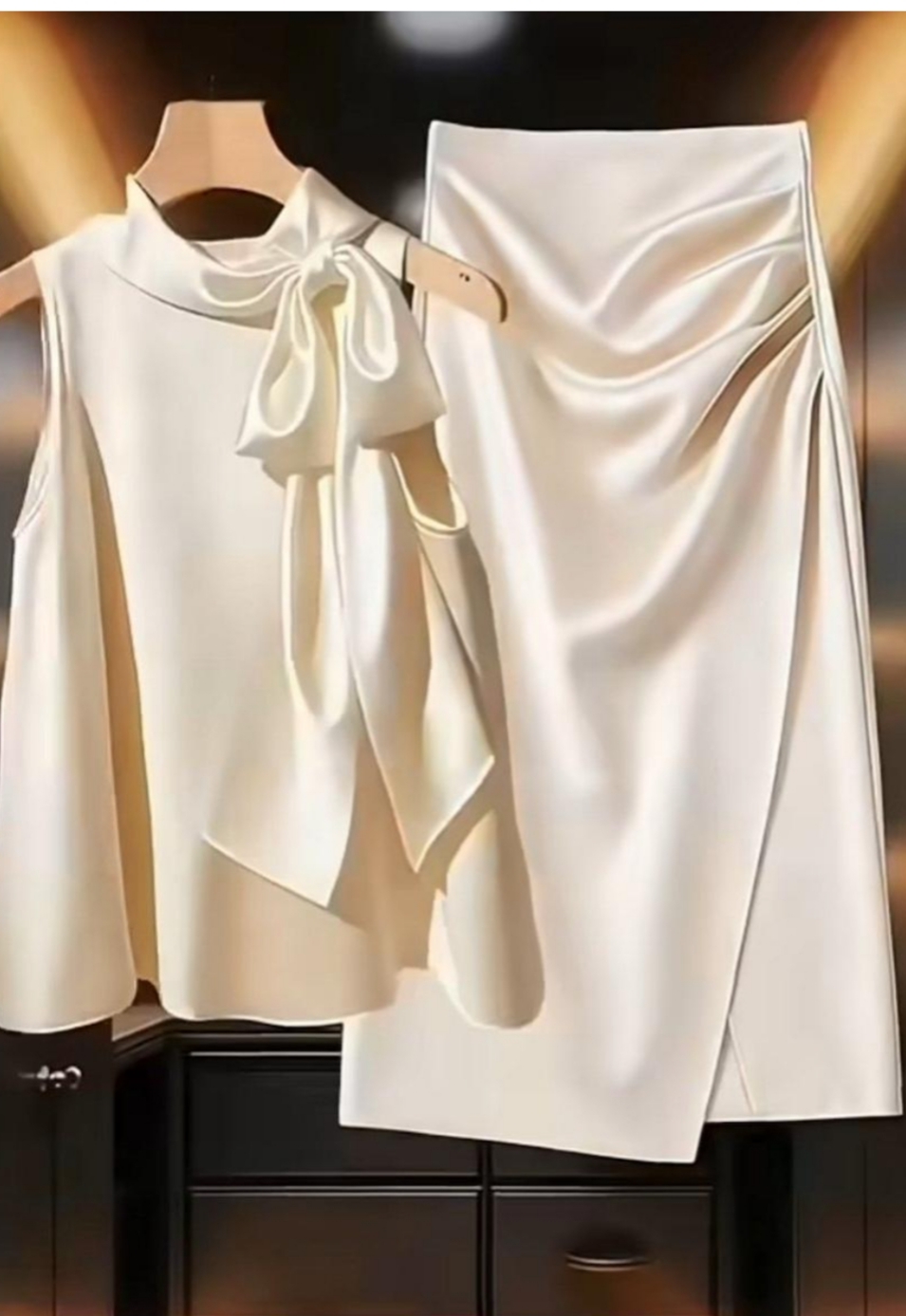 این ست لباس ساتن شامل بلوز بدون آستین با یقهپاپیونی و دامن چیندار است که با پارچهی لطیف و براق ساتن دوخته شده. رنگ کرم روشن و درخشش خاص پارچه، ظاهری الگانس و زنانه به شما میدهد.